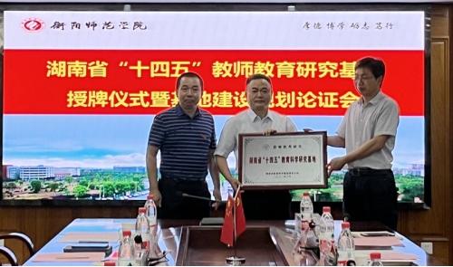 6月24日上午,湖南省“十四五”教师教育研究基地授牌仪式暨基地建设规划论证会在东校区办公楼二会议室举行。省教育科学规划办常务副主任、省教育科学研究院教育规划所所长黄龙威为基地授牌,校长、基地主任皮修平教授,基地首席专家、教育科学学院吴云鹏教授接牌。副校长聂东明、刘俊学出席仪式。