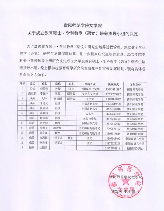 衡阳388vip太阳集团文学院关于成立教育硕士·学科教学(语文)培养指导小组的决定
