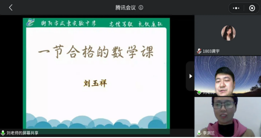 2022 年3月3 1 日下午,为促进2018级师范生对数学课堂教学策略的有效应用,数学与统计学院特邀衡阳市成章实验中学的刘玉祥老师在腾讯会议平台开展题为“一节好的数学课”的教育教学讲座。我院副院长李浏兰主持了本次活动, 2018级数学与应用数学专业全体成员(包括南岳学院2018级数学与应用数学专业学生和数学教育研究生)积极参会学习。
