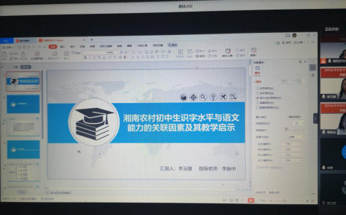 由于疫情原因,本次报告论证会通过腾讯会议在线上开展,参与本次会议的有:外请专家湖南师范大学学科教学(语文)学科负责人、教授张良田,衡阳市八中校长、语文中教正高教师文思源,衡阳市八中语文中教高级教师李自生;硕士研究生导师任美衡、李振中、朱迪光、左其福,研究生秘书文玲;文学院2019级研究生谭咏佳、陈瑶和李玉婕,以及2020级学科教学(语文)教育硕士部分研究生新生。报告会由文学院主管副院长李振中主持。