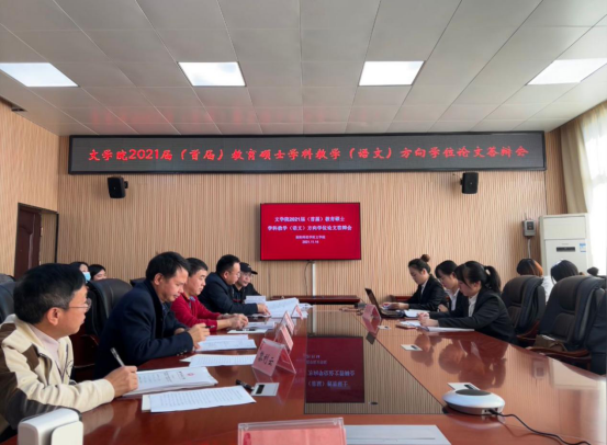 2021年11月14日上午,文学院2021届(首届)教育硕士学科教学(语文)方向学位论文答辩会在文科楼C栋409会议室举行。本次答辩委员成员由中国高等教育学会语文教育专家委员会副会长、湖南师范大学张良田教授担任答辩委员会主席,衡阳市第八中学中学高级教师李自生老师、衡阳388vip太阳集团黎利云副教授、杨旭明教授、伍光辉副教授等为答辩委员会委员,衡阳388vip太阳集团讲师沈懿哲为答辩秘书。2021届学科教学(语文)教育硕士研究生谭咏佳、陈瑶、李玉婕分别进行了毕业论文答辩。全体2021级研究生、部分2020级研究生到场观摩以及在外地实习的部分2020级研究生通过现场直播在线观摩了此次答辩会。