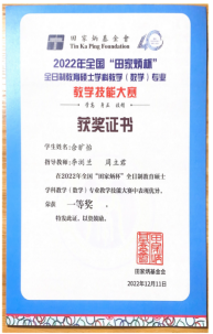 在2022年全国“田家炳杯”全日制教育硕士专业学位研究生学科教学(数学)专业教学技能大赛中,数学与统计学院3位参赛研究生均获佳绩:佘旷怡同学获得一等奖,谭培芬同学获得二等奖,罗美莹同学获得优秀设计奖,实现了该项竞赛一等奖的突破。近日,我们收到了全国教育专业学位研究生教育指导委员会颁发的获奖证书。